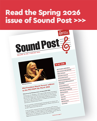 Following a meeting of the MUI Executive this week in Liberty Hall in Dublin, MUI Vice-President, David Agnew, said: “The Arts Council provides key funding streams for cultural workers. We are specifically concerned about musicians and the possible impact on them of any freeze on the Arts Council’s operation during a review. This cannot happen and would only result in damage to the arts sector and increase issues for musicians who depend on performing at cultural events which it helps fund.”